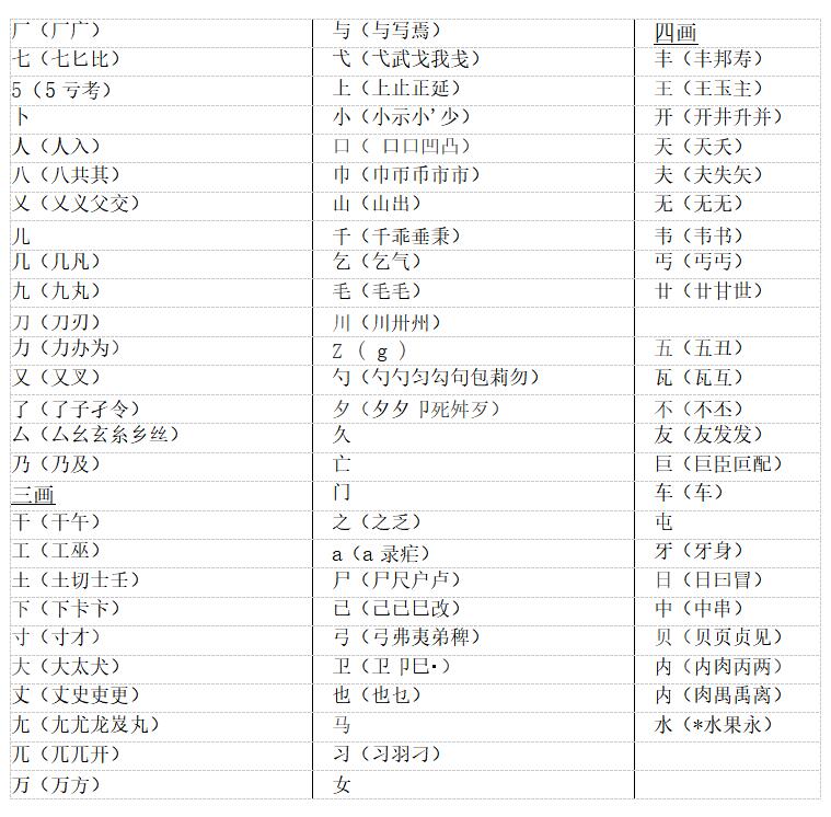 (3)(无字根字表》。部分独体汉字,不可拆分字根,无法归类,为了便于检字查询,设有《无字根字 表》。例如丌、彳、冇、书、凸、纠、年、祁、卣、钊、事、芈、寒等。