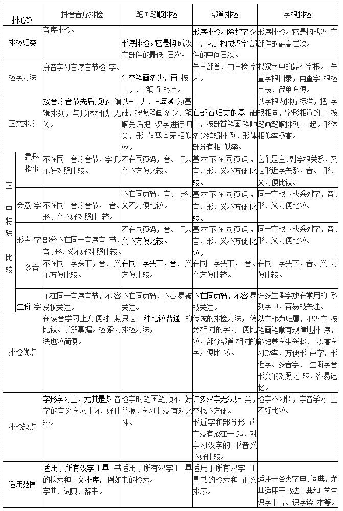 在目前常用的汉字排检中,常见的是汉语拼音字母、部首、笔画笔顺等三种排检方法,四角号码检字 复杂不常用,而且不能用于正文排序,所以不进行比较和讨论。下面把拼音字母、笔画笔顺、部首三种排检 方法与字根排检方法进行比较。