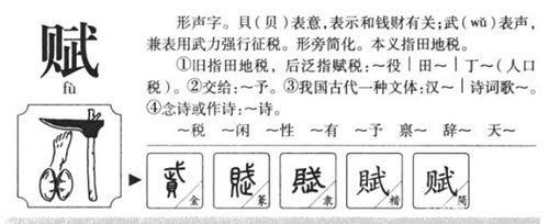 比如“赋”这个字,如果我们从汉字字源的角度来学习它,你就会发现,你会更容易理解它,使用它,不容易出错。“赋”是由“贝”和“武”两个汉字组成的,“贝”是古代的一种货币,是钱的意思;“武”则是军事、打仗的意思。