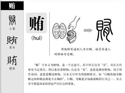 知道了这些,当我们碰到“贿”这个字的时候,就可以这样理解这个字的意思“手拿肉送给希望被收买的人”,就是贿赂了。这样学习汉字,比起机械式的读读、背背、抄抄,是不是更有效率,印象更加深刻呢?