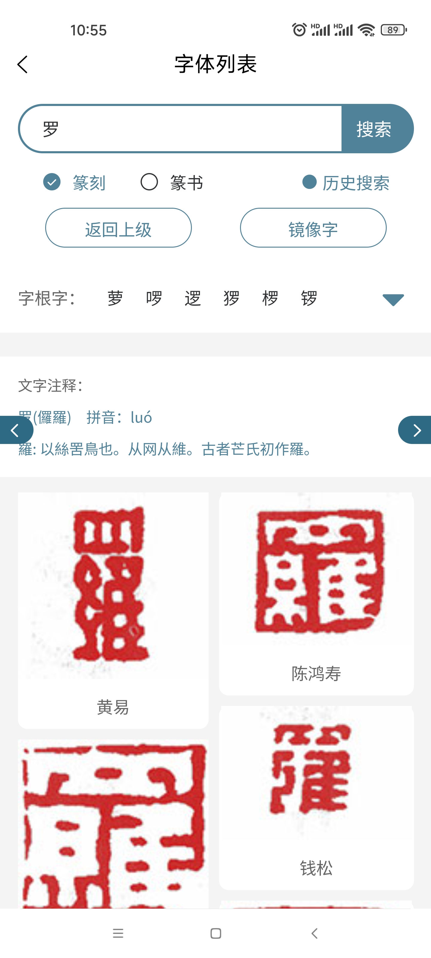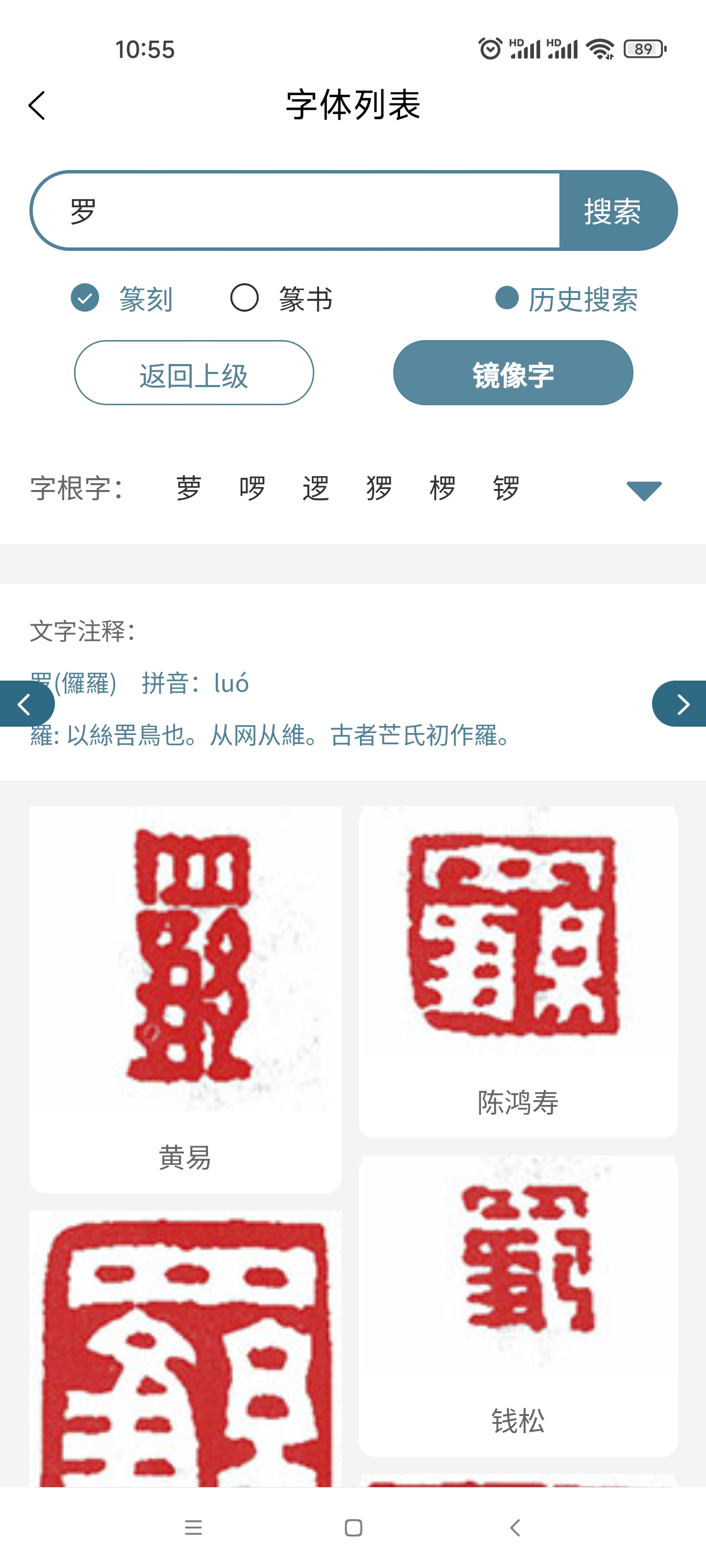 4、设有镜像字功能键。点击后可显示该汉字的镜像字(反字)。上下滑动能查找该汉字相关的系列汉字的各种篆刻镜像字(反字)书体写法,左右翻页,能查找该汉字相关的系列汉字的各种篆刻镜像字(反字)书体写法。