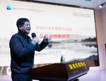 主题讲座的第一场是湖南省辞类汉字字根排检输入中心创始人,《中华字根字典》主编罗健教授主讲,主题是《对现行汉字排检方法的反思和创新研究》。罗健教授从汉字的造字原理出发,为我们解析了汉字排检的几种方法,并且指出了现行汉字排检方法的优势与不足,创新性地提出了一种新的汉字字根排检法,为汉字的排检工作和汉字教学提供了一种新的思路。
