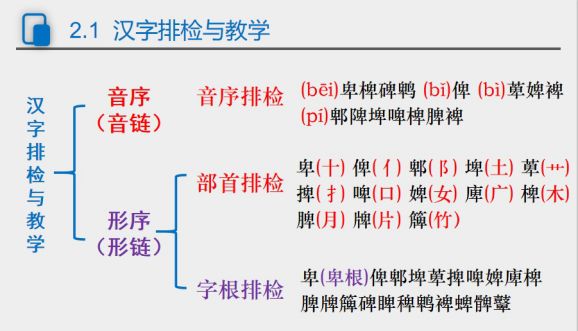 同时分析了汉字的内部结构,指出汉字是意符和声符构成的。独体字是由意符构成,复合字是由“意符+意符”或者“意符+声符”构成的。再通过声符和意符在汉字中的地位,总结得出,字根排检法是按照汉字声符排列的一种排检方法,抓住了汉字的主要部件,形成汉字的形体链条,便于进行汉字教学。