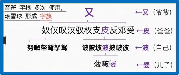 字根字典很好的解决了这些问题,查字根,再通过字根带一系列家族汉字,借用音上的联系来帮助学生批量的学习汉字。彭教授风趣地拿血缘亲属关系比喻字根和字根字,比如“又”(爷爷)衍生“皮”(爸爸),“皮”衍生“波”(自己),“波”衍生“婆”(儿子)。通过这种通俗易懂的比喻和类比,让大家一下子就明白字根和字根字这种成组的家族关系。彭老师也肯定《中华字根字典》对汉字学习的帮助。